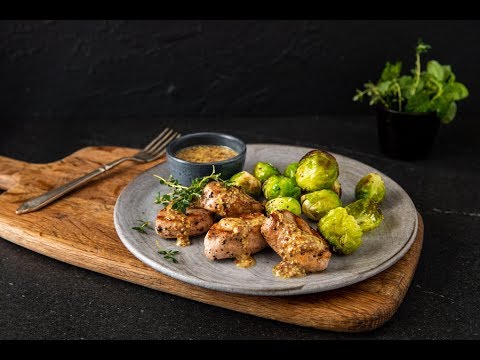 Sheet Pan Pork Tenderloin And Brussel Sprouts }}- INGREDIENTS: 3 oz. brussels sprouts 1 tbsp. olive oil 1 tbsp. butter 1 tsp. apple cider vinegar 4 oz. pork tenderloin 1 tbsp. whole-grain mustard CrossFit® ...
